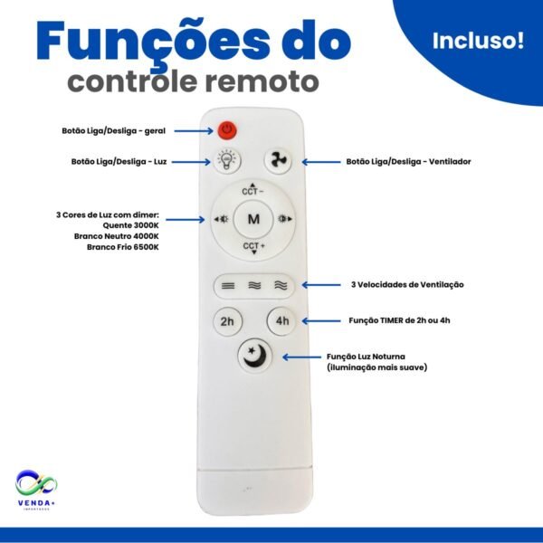 Além de iluminar, garante circulação de ar eficiente e confortável, tudo controlado facilmente através do controle remoto incluso.
